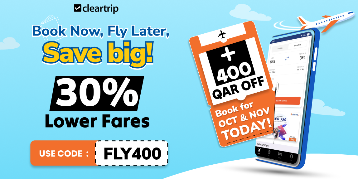 Why wait for prices to rise? Enjoy 30% lower fares and score additional 400 QAR off flights when you book ahead for Oct or Nov. Use code FLY400 now.